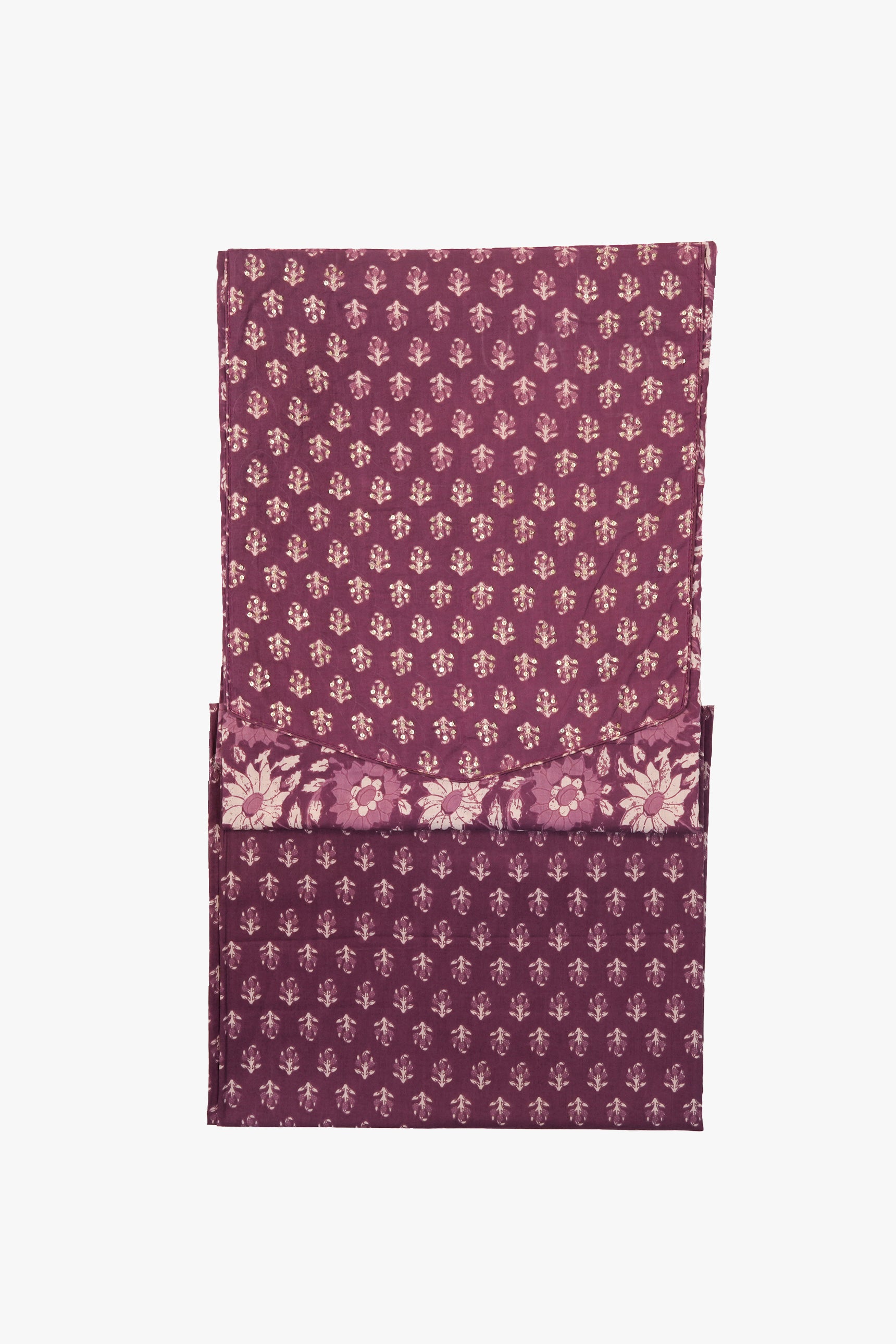 Amethyst Gul celebrates rich purple tones on breathable cotton with floral prints, accentuated by embroidery. A regal embroidered cotton suit set for evenings, festive wear, and special occasions.
