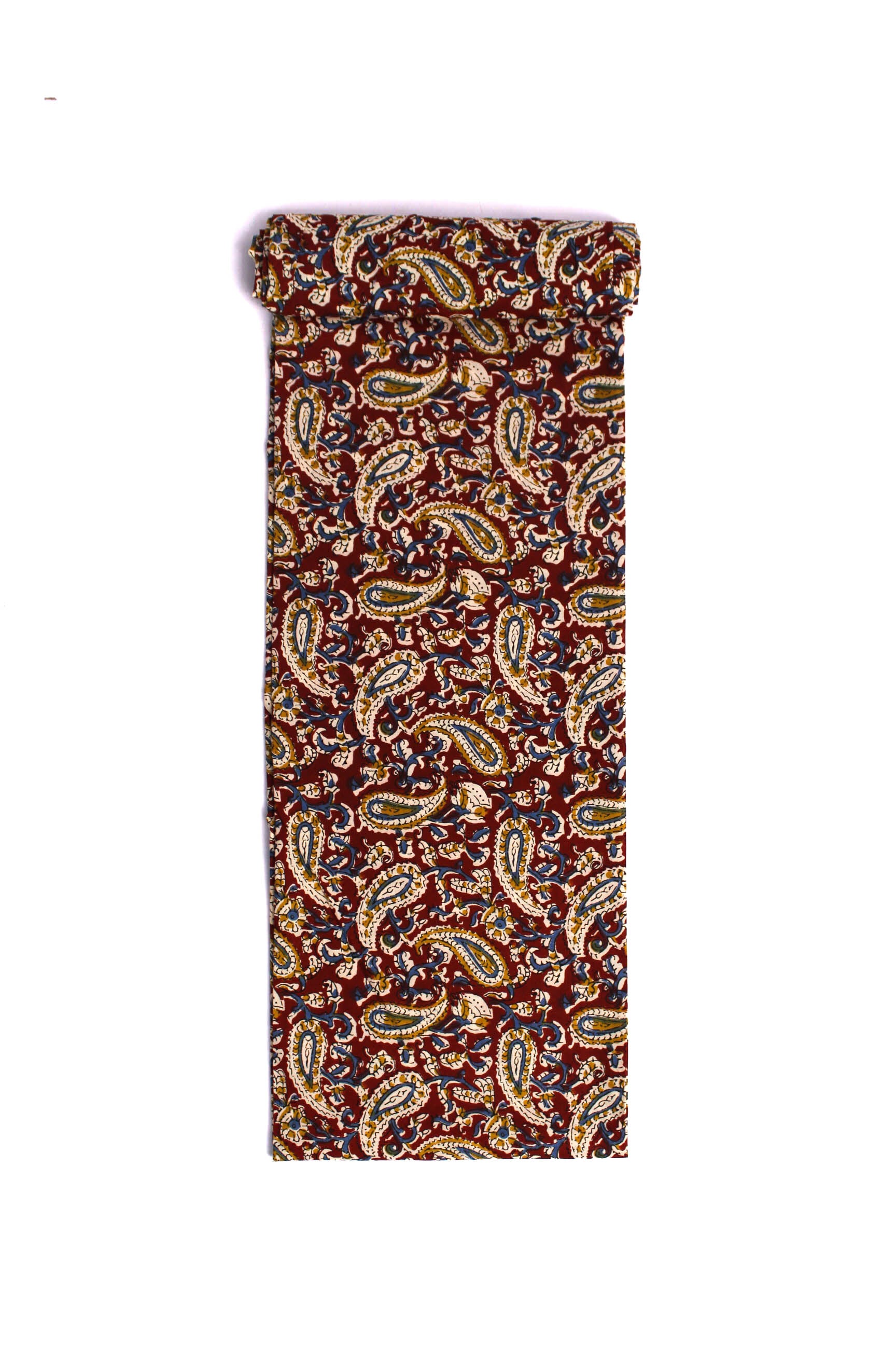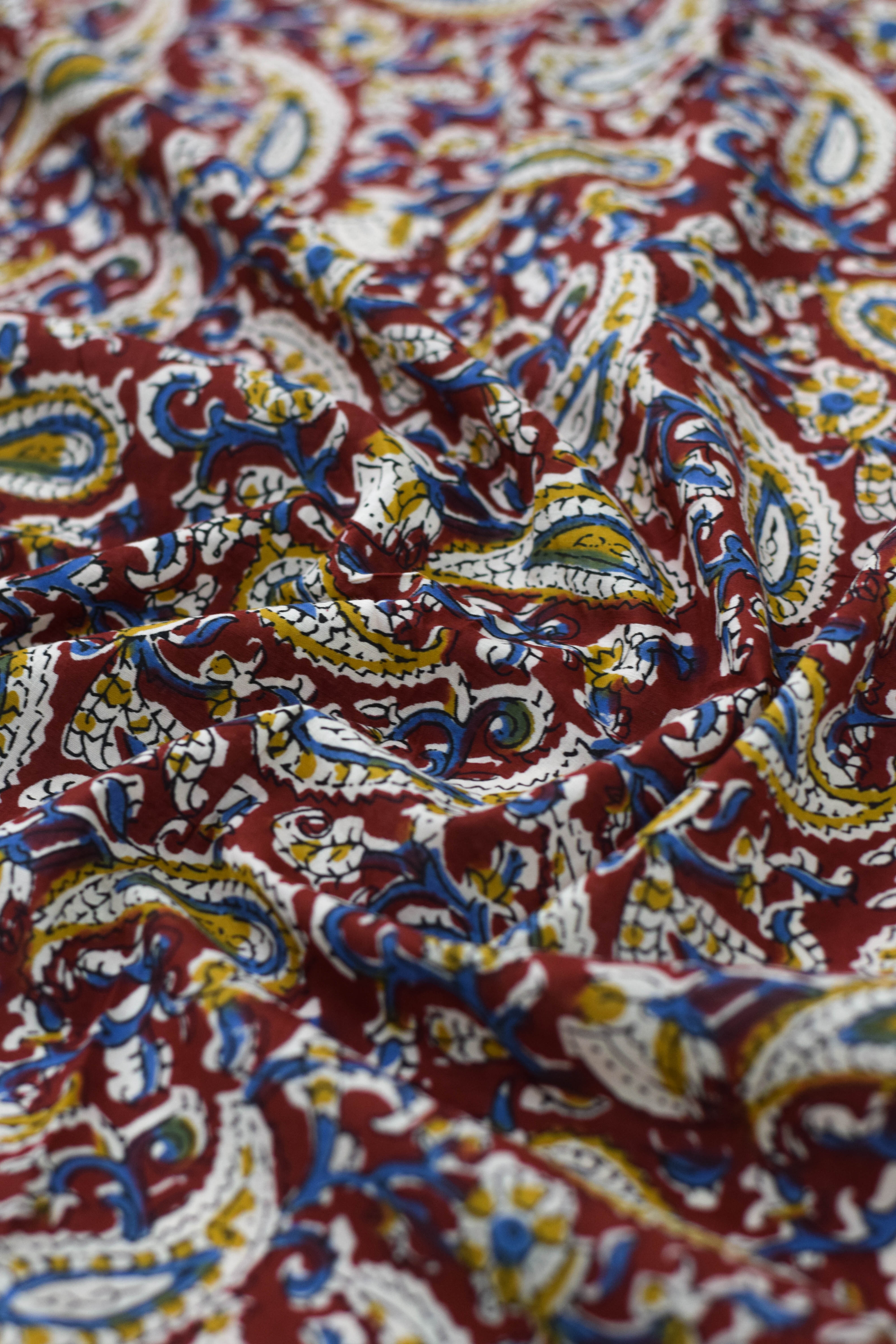 An opulent scroll of maroon vines, paisleys, and floral bursts over cream—this fabric channels the ornate artistry of Awadhi murals.