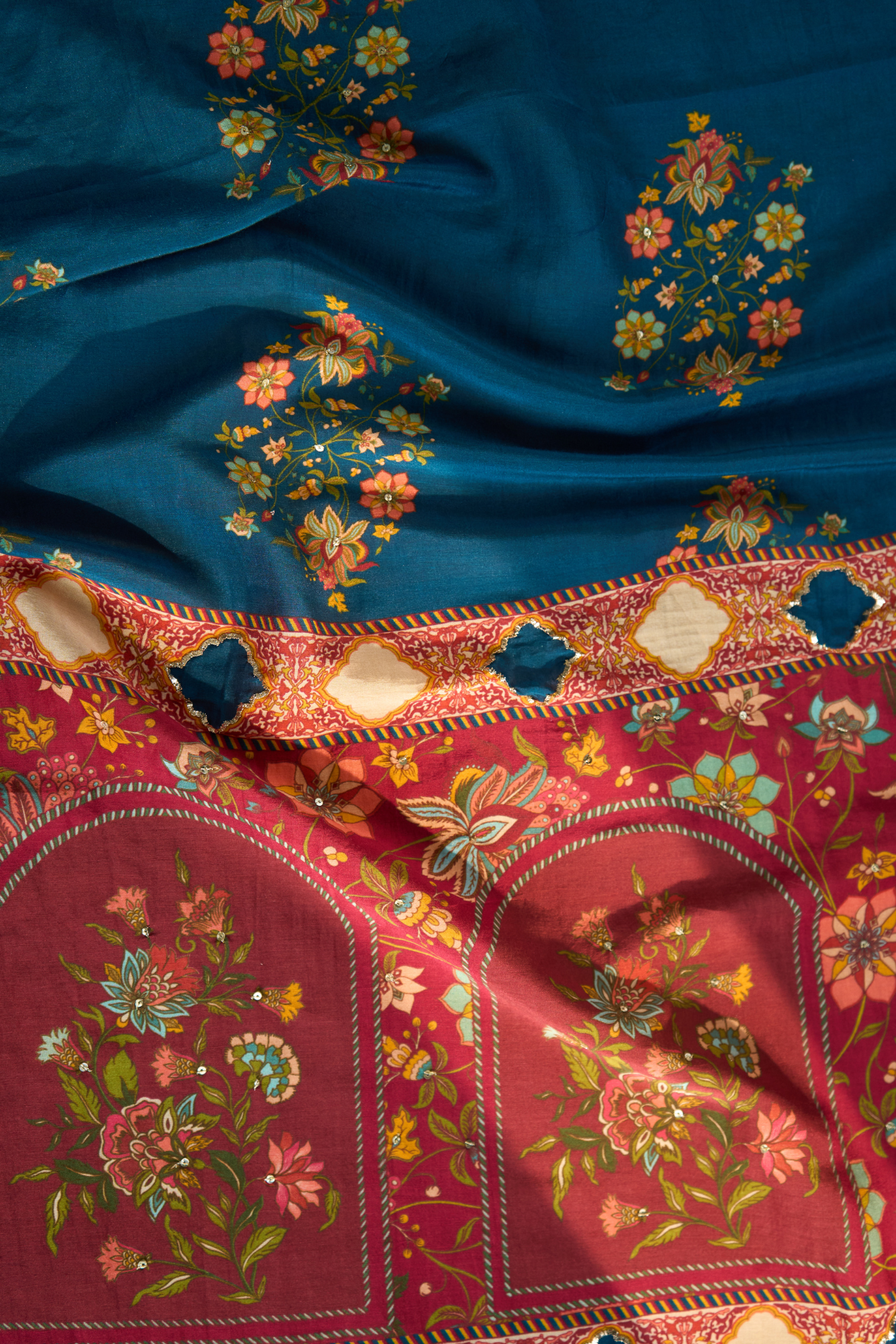 This set blends a rich blue base with maroon floral prints inspired by Jaipur motifs. Crafted in soft cotton silk, it comes with a printed dupatta, solid bottom, and mulmul lining—perfect for wedding season, festive lunches, or everyday elegance.