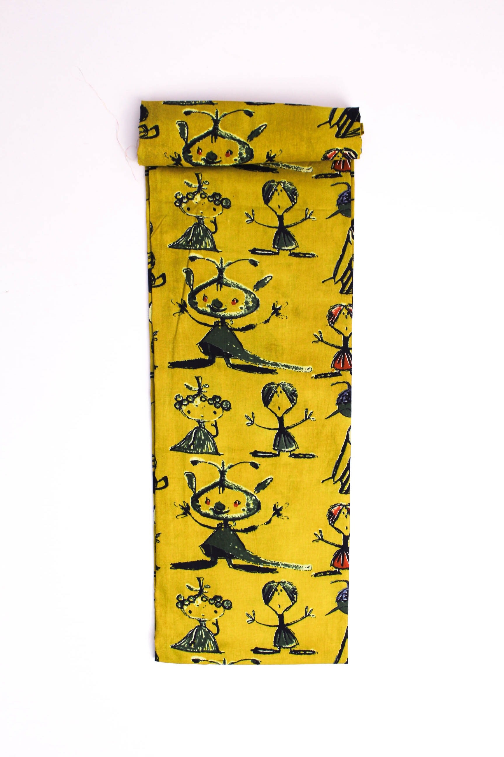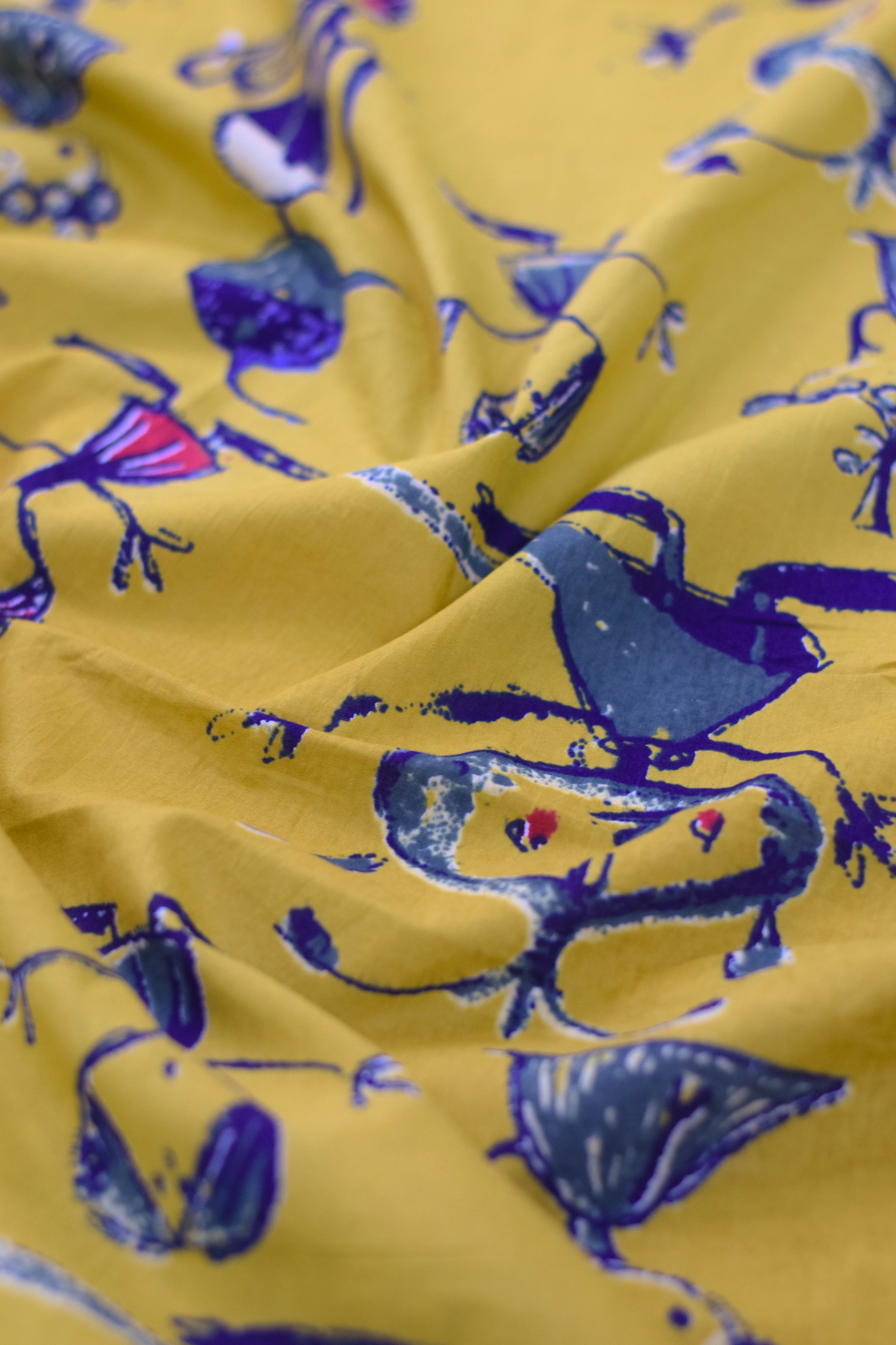 A playful mustard-yellow fabric featuring abstract tribal figures in vibrant reds, greens, and blues. This quirky print celebrates movement and storytelling, perfect for making bold creative garments.