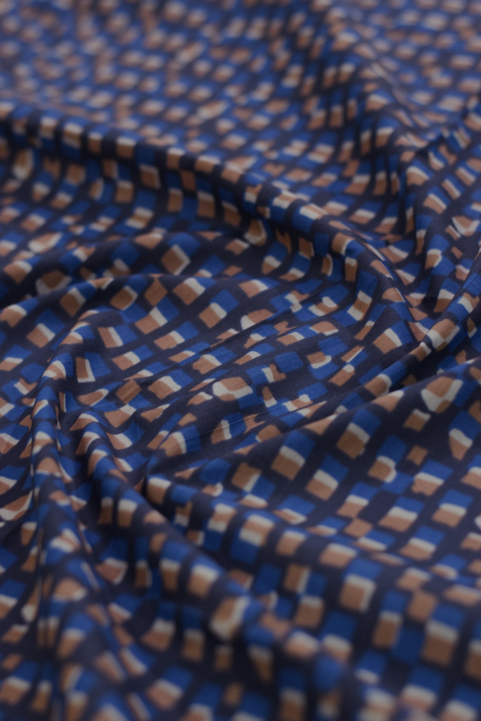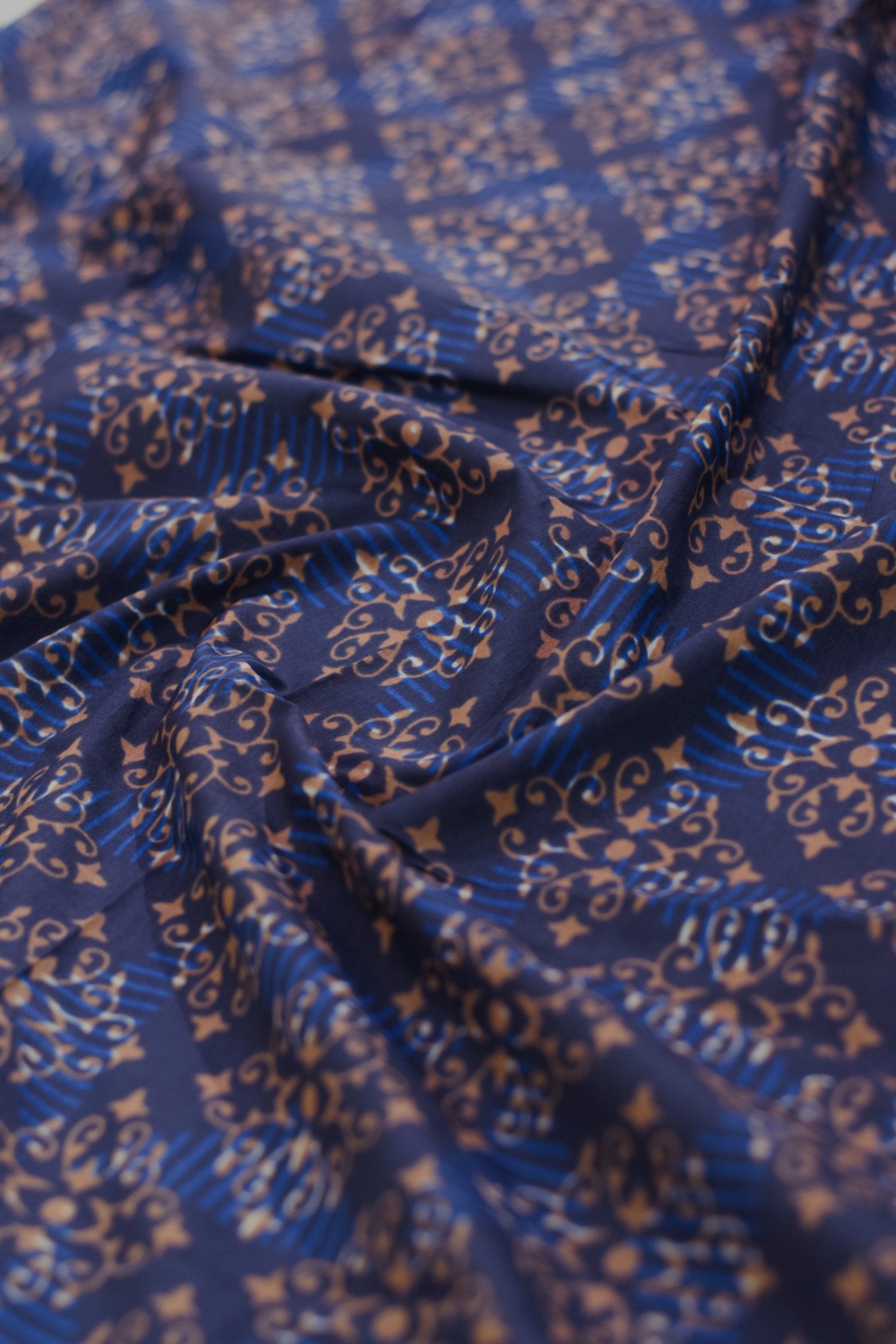 A stunning blend of rustic blue blocks and intricate beige florals on a deep base. Perfect for those who love earthy tones with a modern artistic flair.