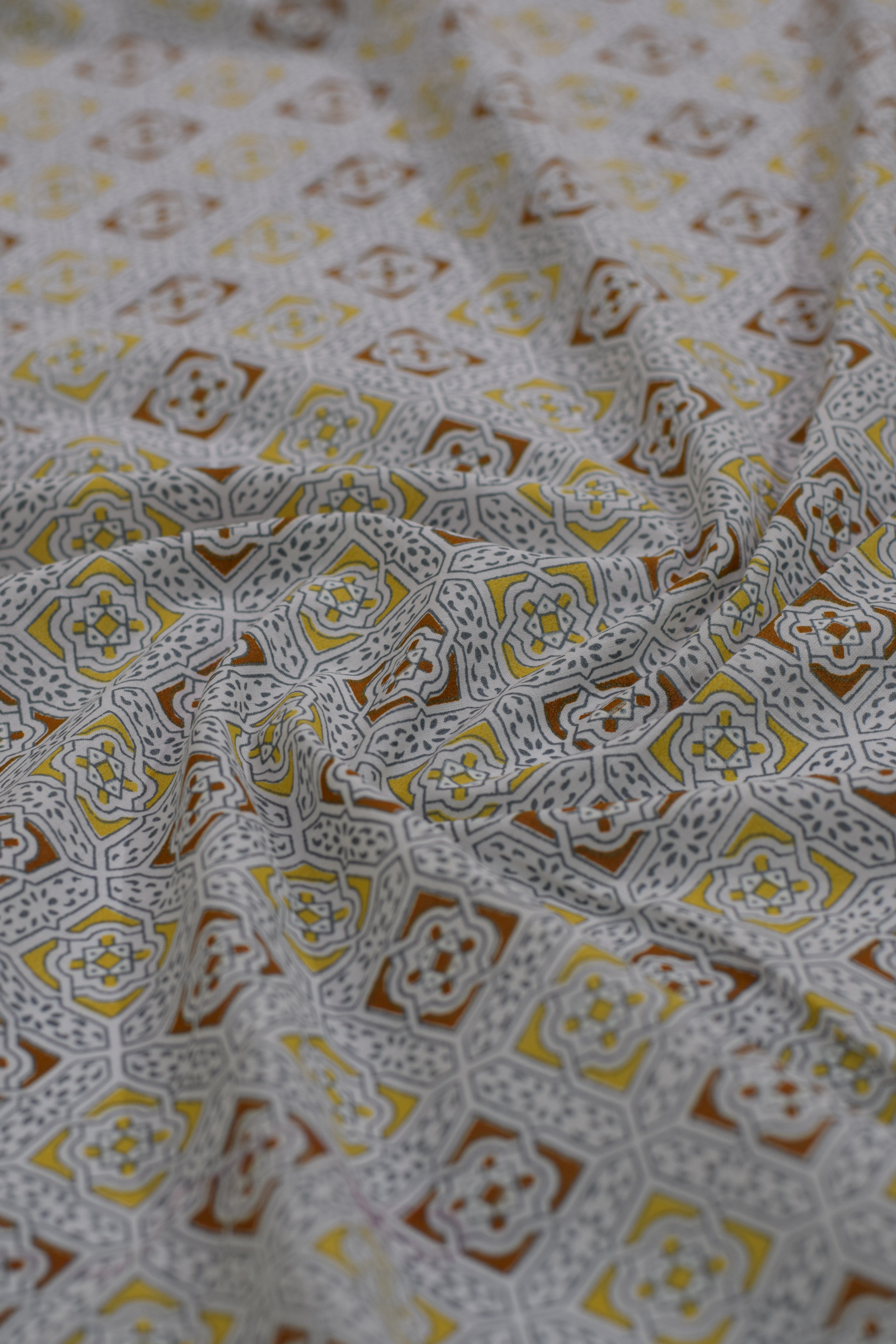 A beautiful pairing of subtle floral motifs in soft golden and blue tones with a complementary geometric mosaic print. The combination exudes a rustic sophistication perfect for elegant, everyday wear. Crafted in breathable cotton, this suit set offers both comfort and a refined artistic charm.