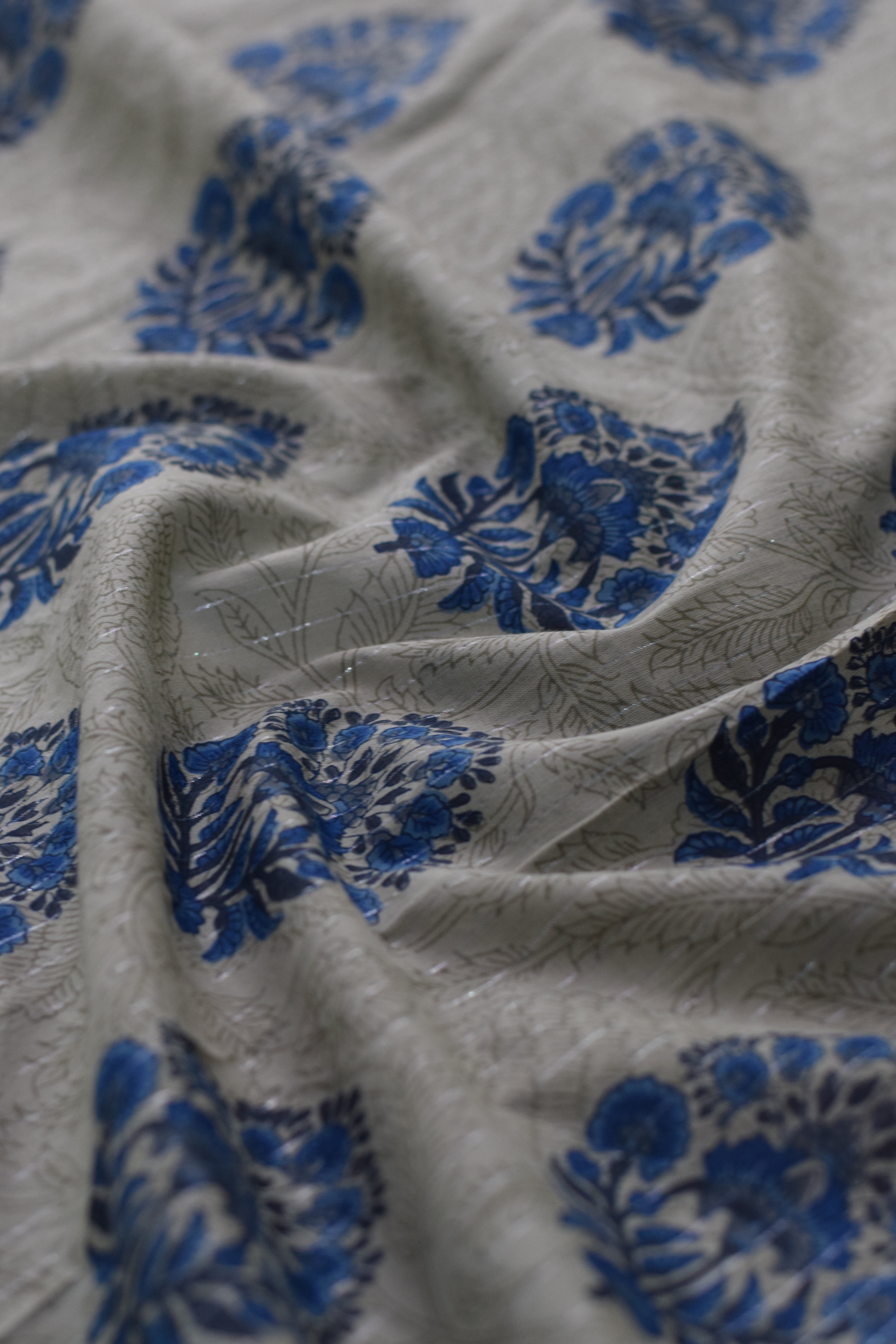 Beige fabric accented with detailed indigo blue Mughal-inspired floral bootas and faint background vines. A timeless choice for traditional attire with a contemporary edge.