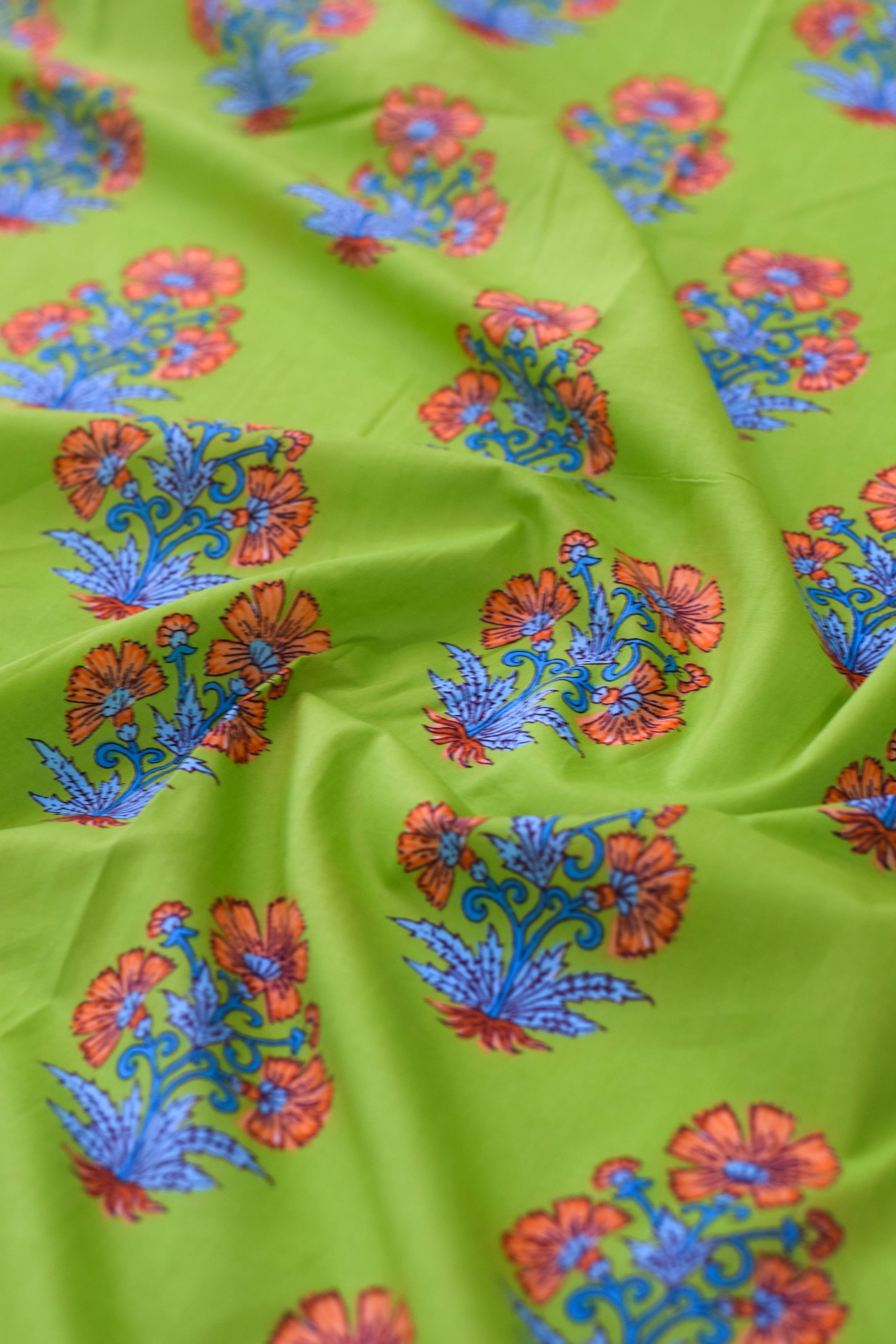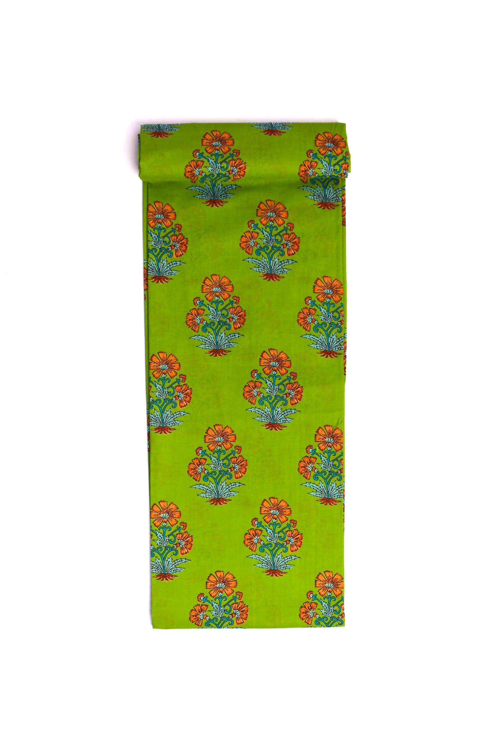 Fresh green canvas hosting bright orange floral bouquets, inspired by the gardens of Rajasthan and perfect for a breezy look.