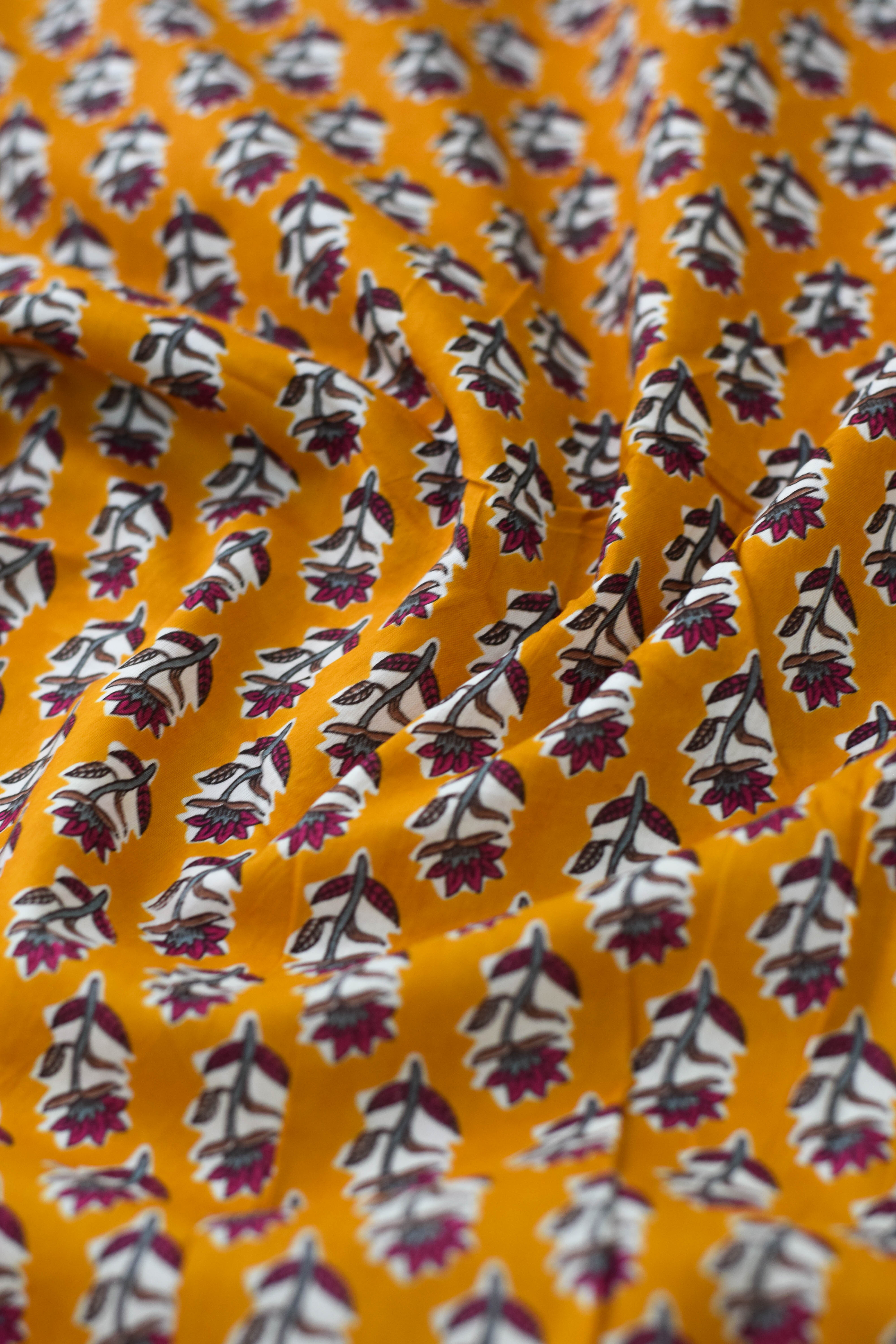 This mustard yellow base features stylized lotus motifs in soft pink and white—ideal for those who love playful yet heritage-inspired prints.