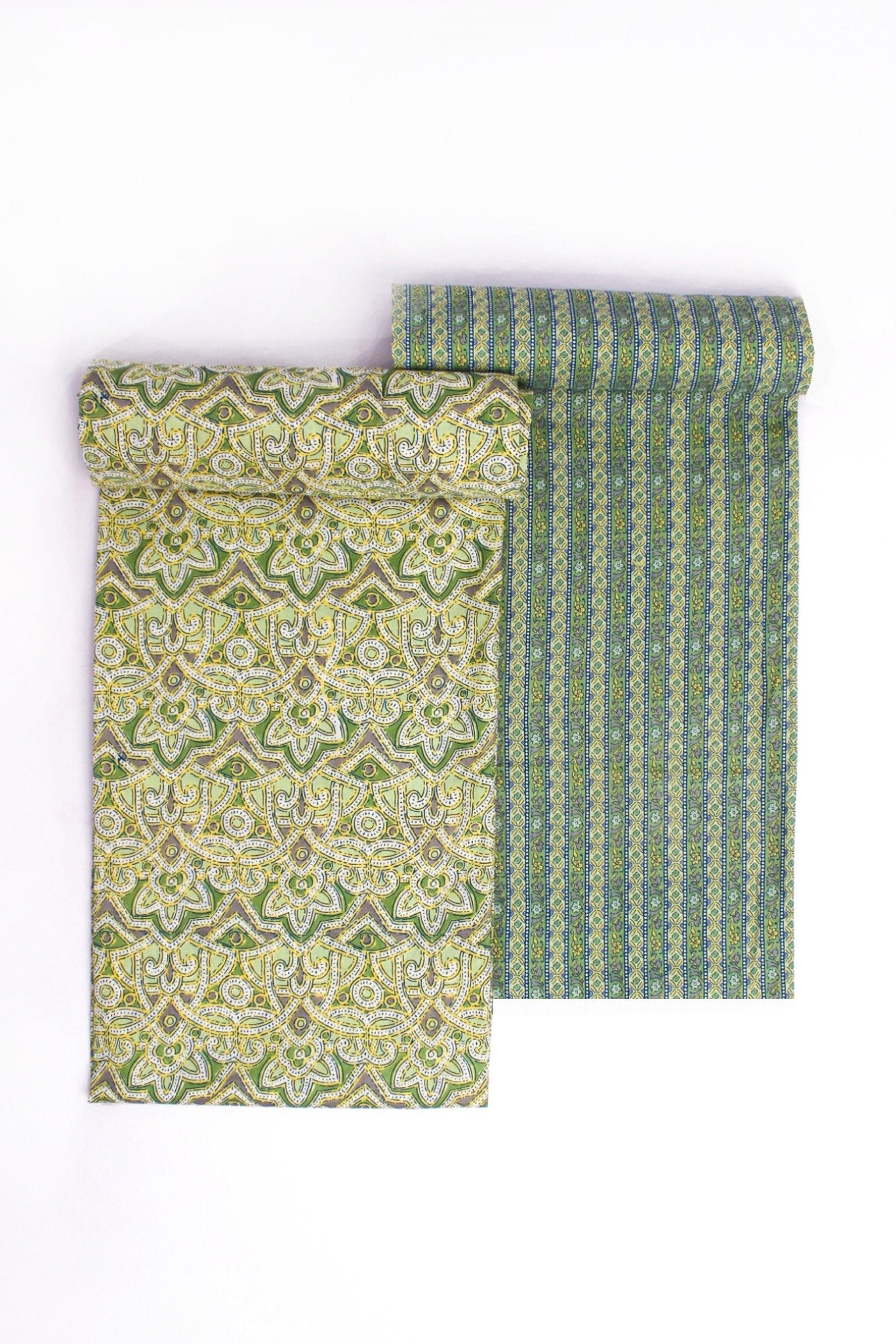 A beautiful blend of pastel green, lavender, and soft yellow, the Pastel Garden Suit Set features delicate floral vines and intricate geometric patterns. The soothing color palette combined with detailed motifs makes it perfect for an elegant daytime look, festive brunches, or summer gatherings.