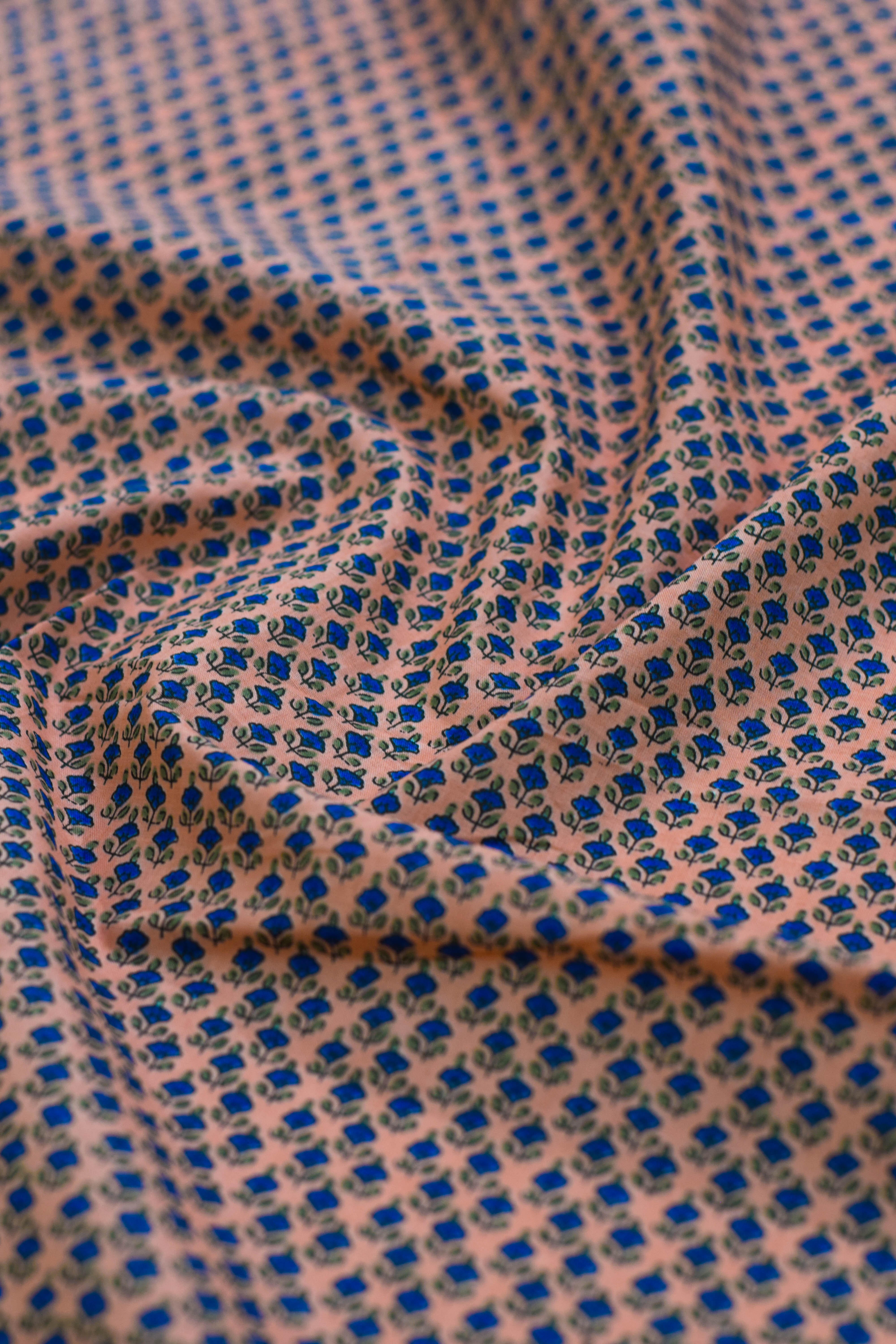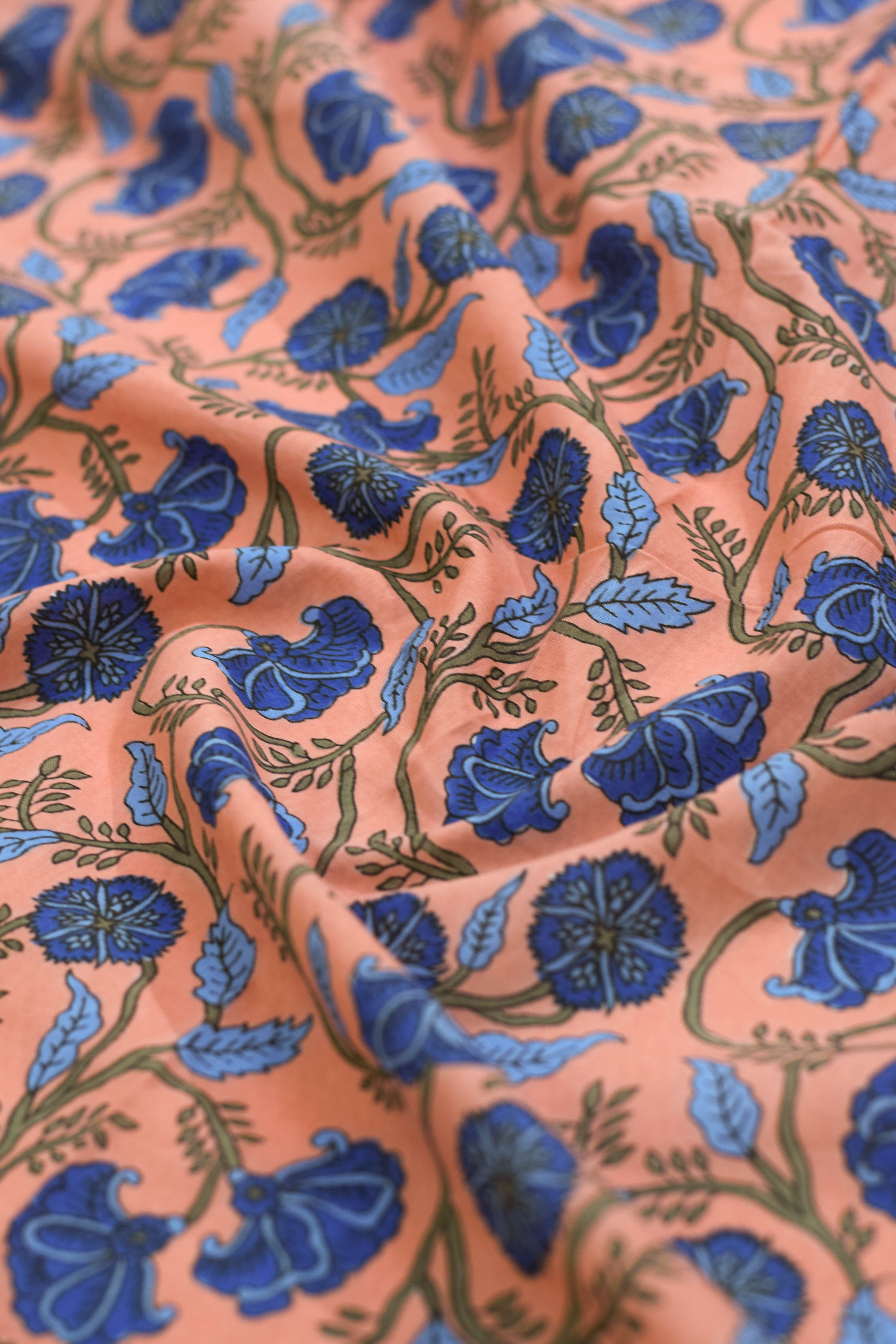 A fresh and vibrant suit set featuring petite blue floral motifs arranged in a uniform pattern across a soft peach base, complemented by a statement floral jaal design on the dupatta with lush blue blooms and intricate leafy vines. The lively colors and hand-blocked artistry add elegance and grace, perfect for cheerful daywear or semi-formal gatherings.