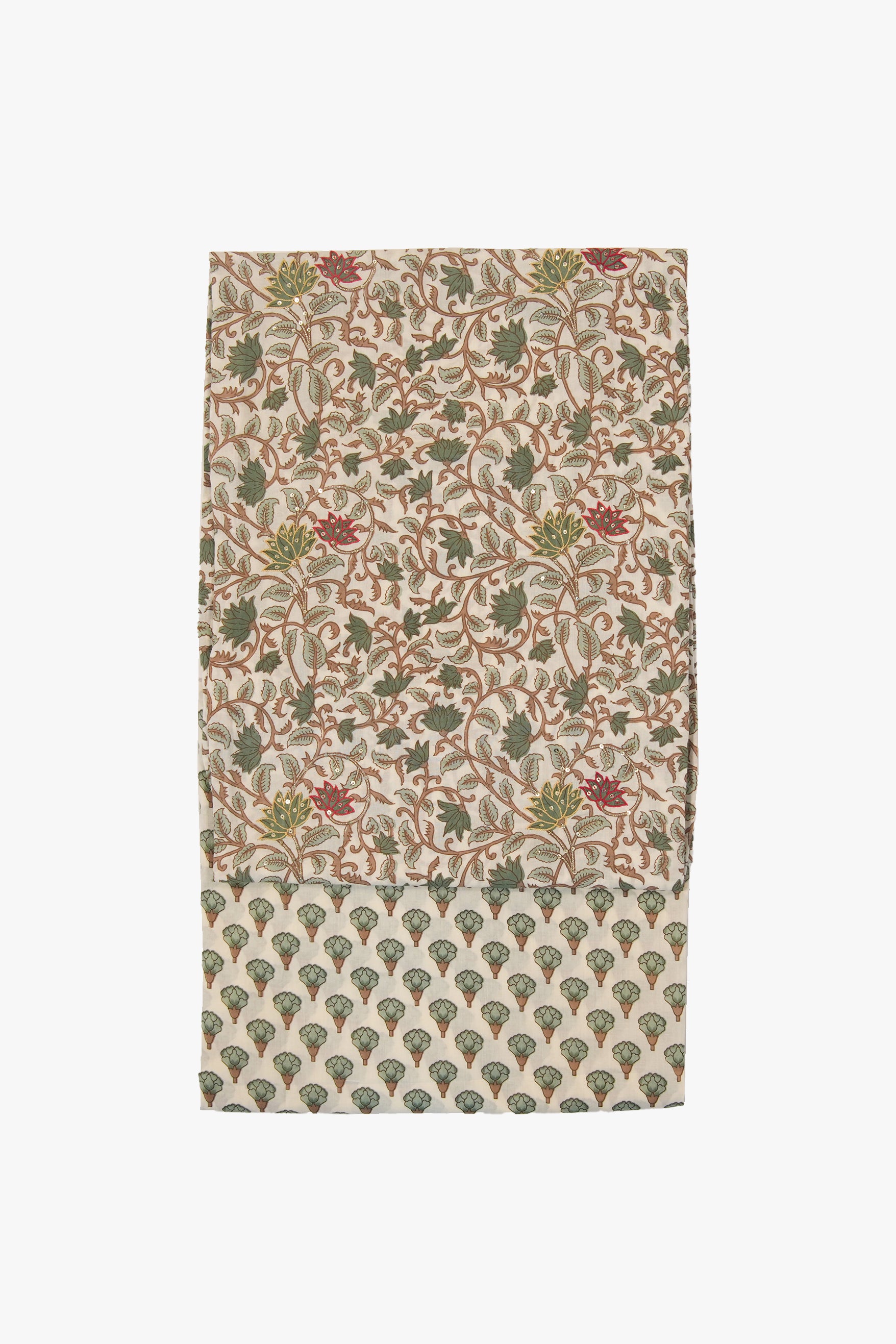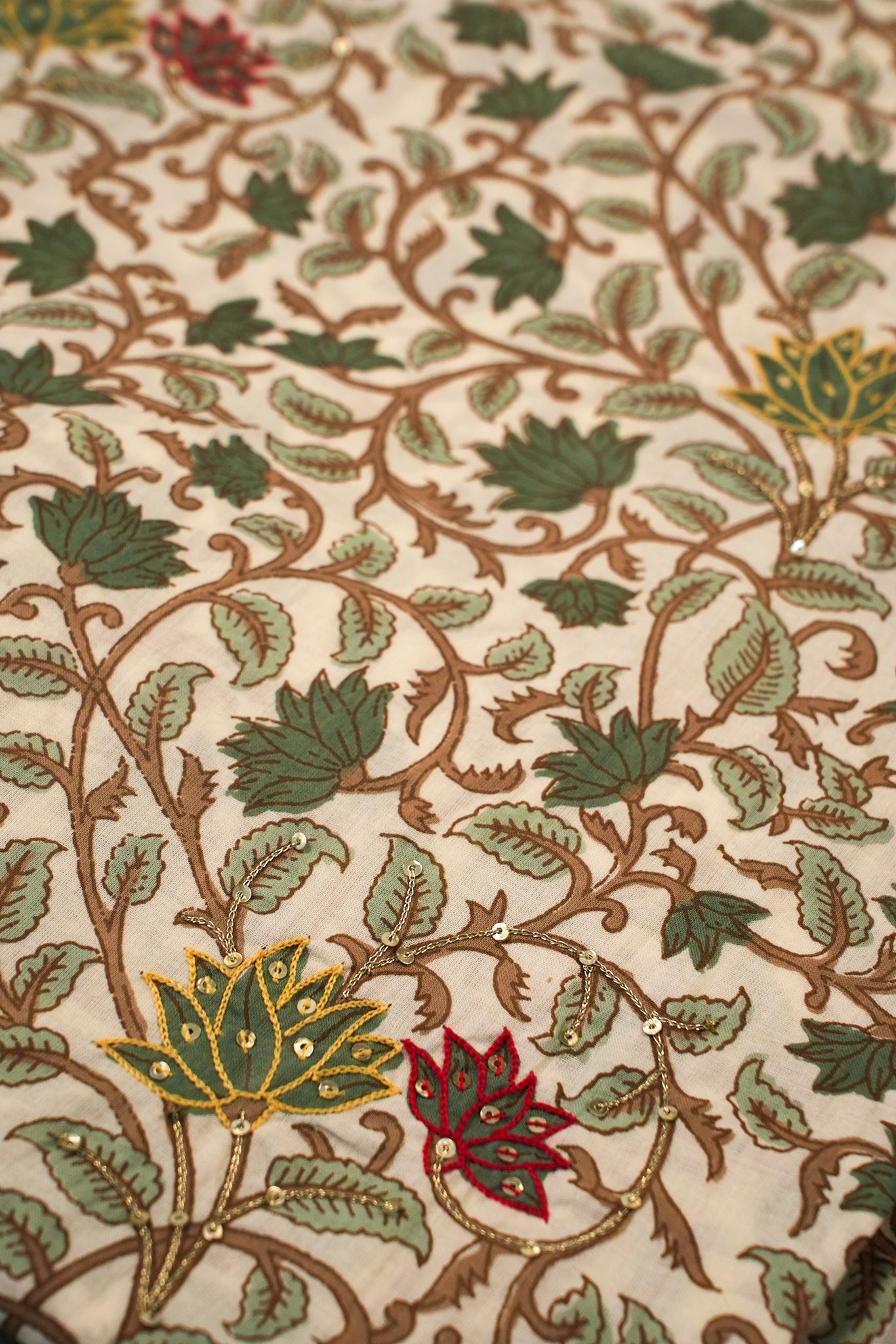 Shvet Valli offers a crisp white cotton base uplifted by green floral and leafy embroidery. This embroidered cotton suit set reflects purity and comfort, ideal for summer wardrobes and serene occasions.