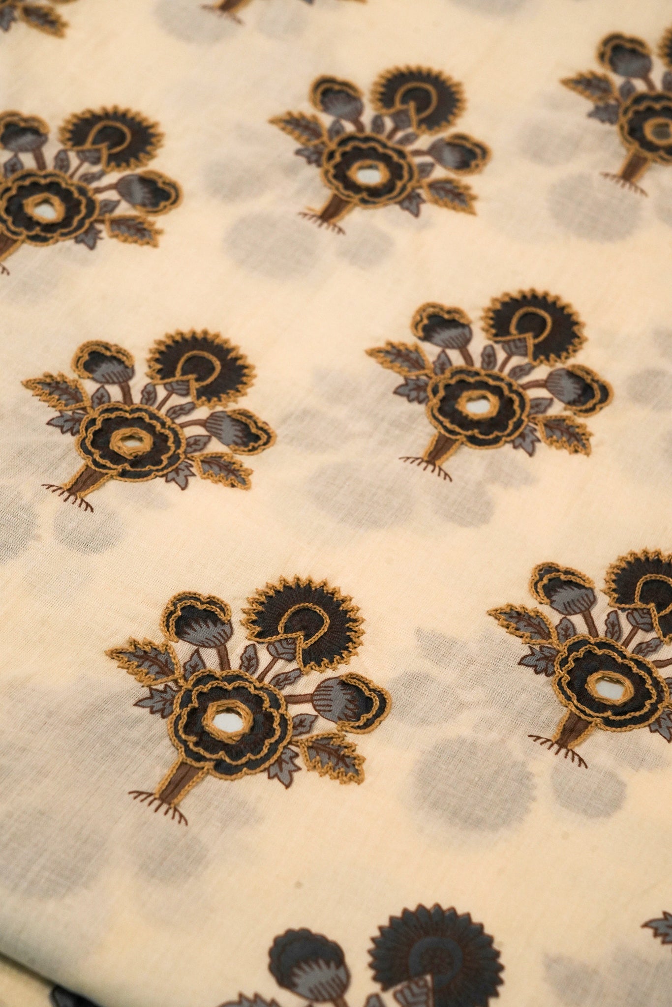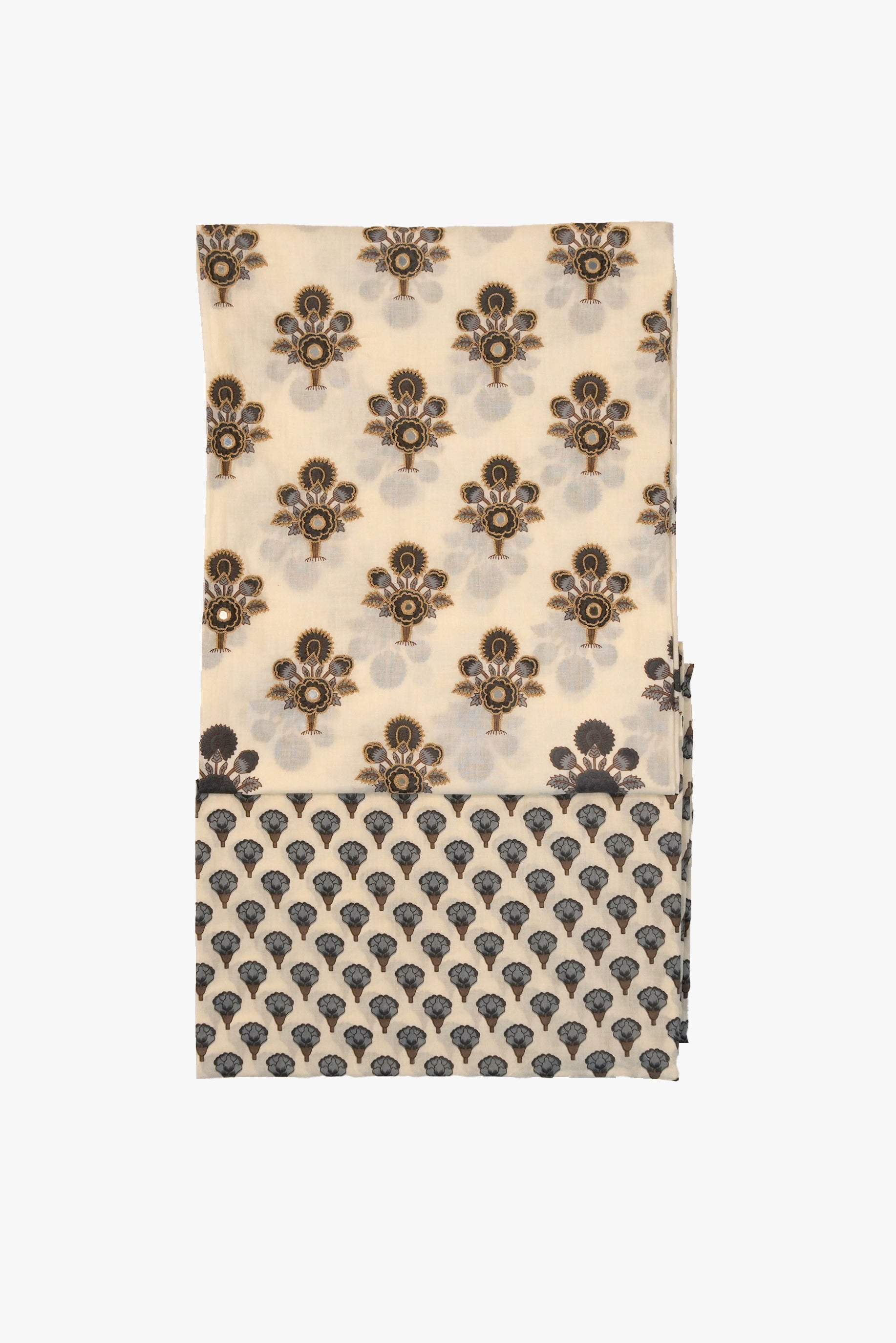 Shwet Megh captures the beauty of soft off-white cotton dotted with grey and blue printed motifs, enhanced with subtle embroidery. A versatile embroidered cotton suit set for office wear or casual outings.