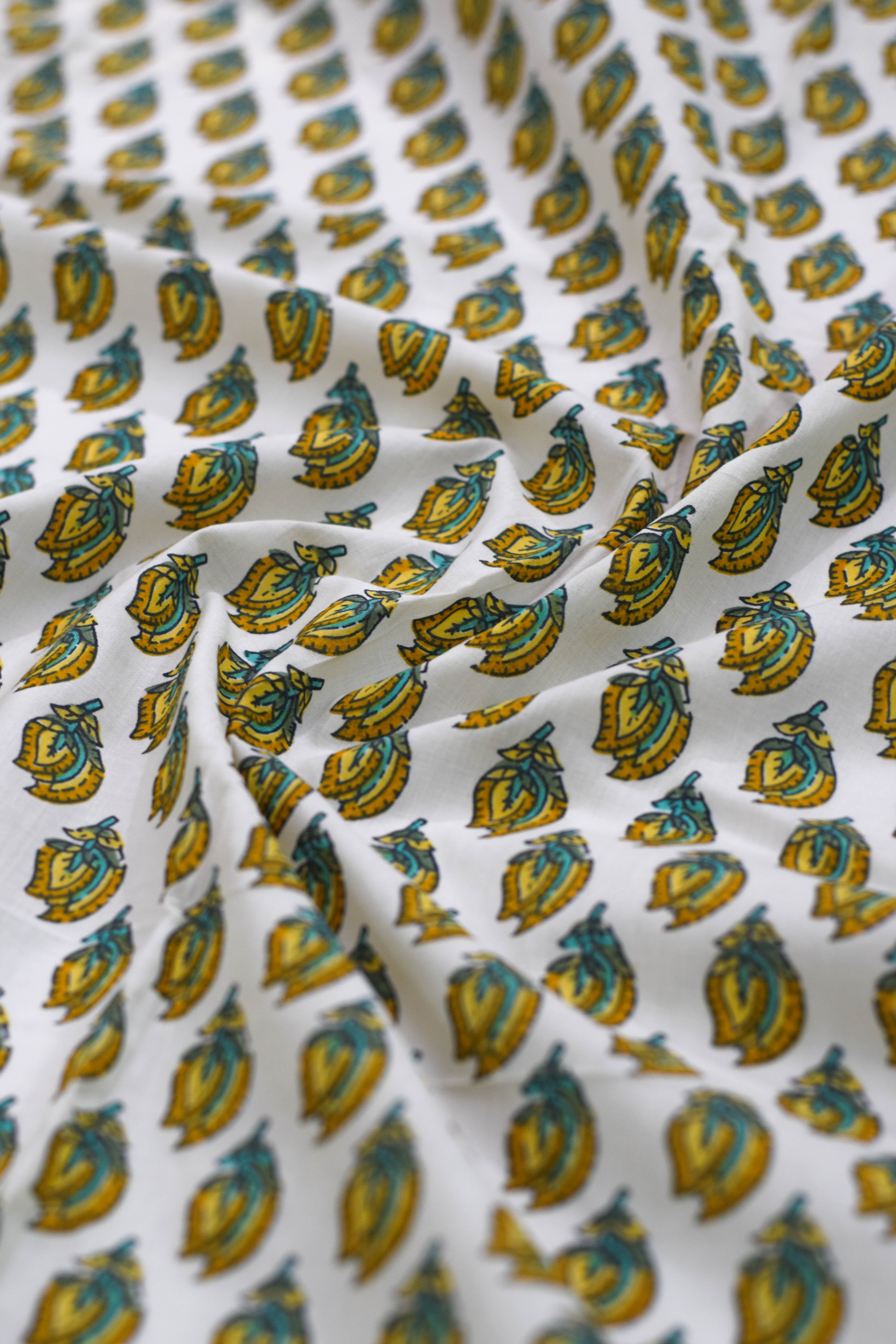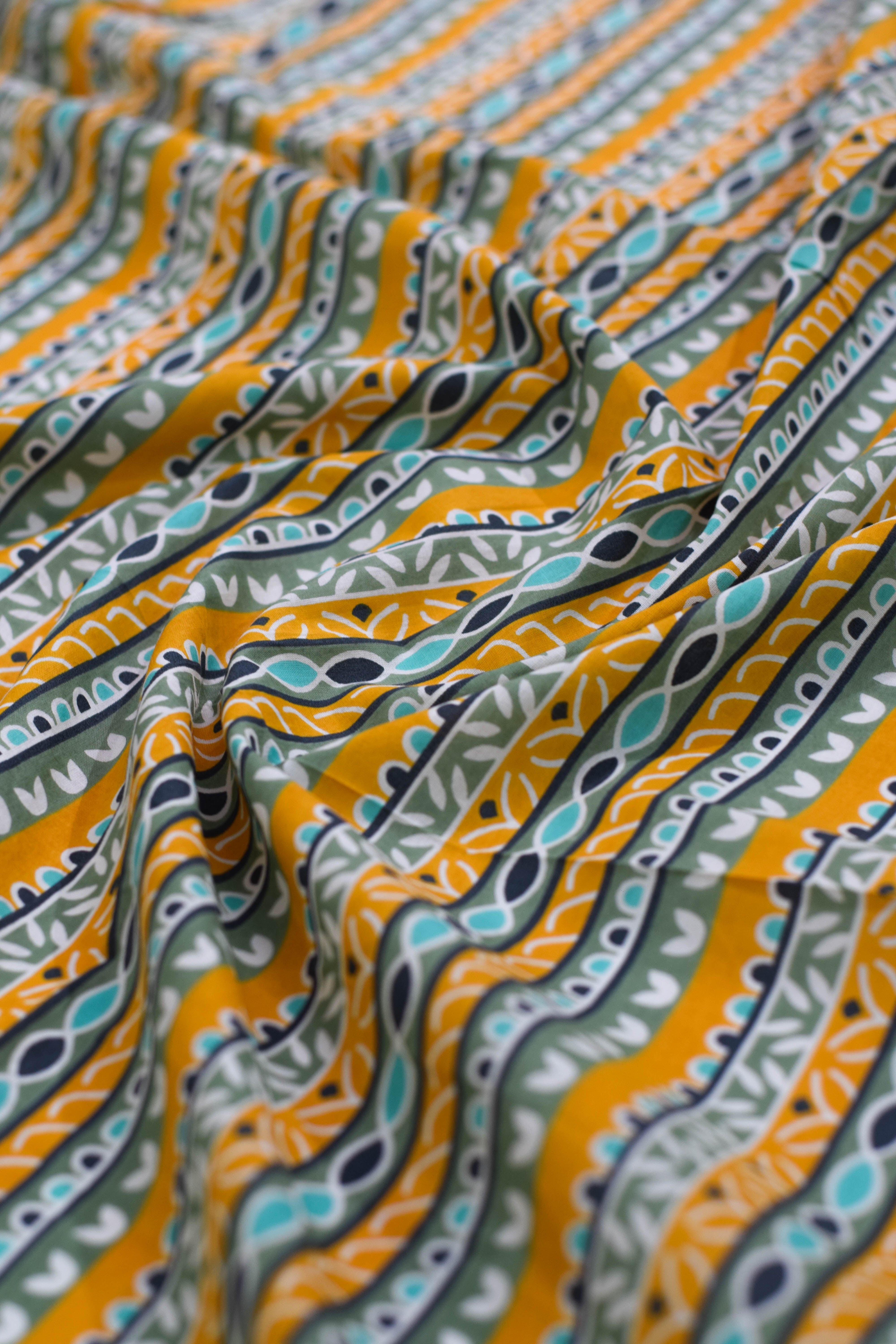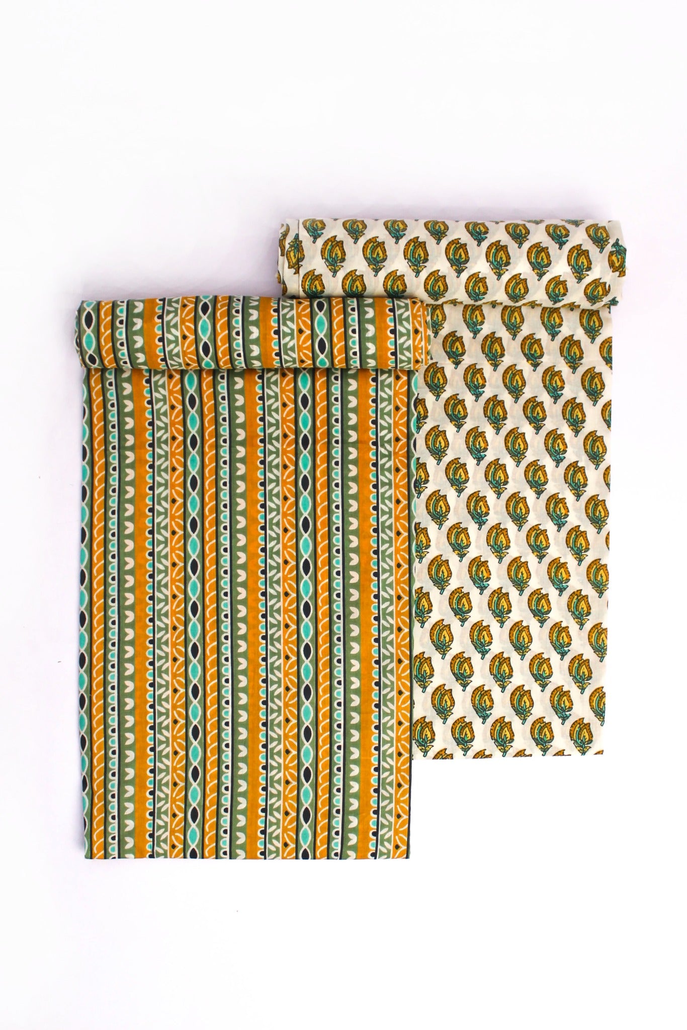 A playful mustard and teal striped top paired with a charming mustard floral motif bottom. Together, they bring a cheerful, earthy brightness, perfect for everyday casuals or daytime gatherings.