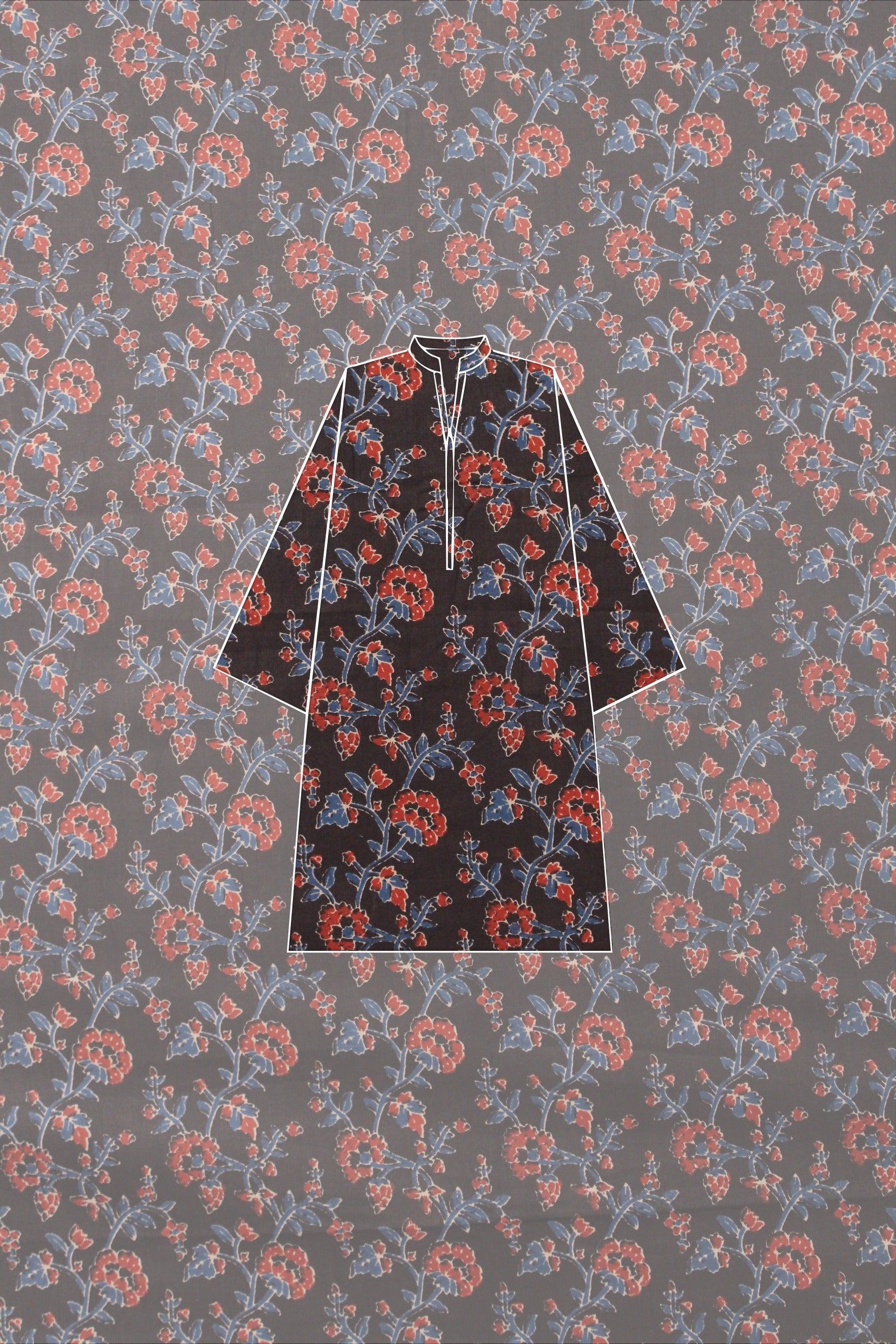 Black canvas adorned with tiny rustic red and cream floral patterns, beautifully contrasted by a deeper and more intricate flowering design. A rich, slightly vintage look for refined daily wear.